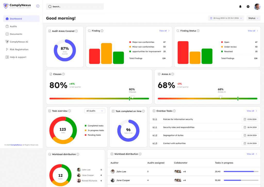With real-time dashboards, AI-driven risk insights, and automated audit trails, CISOs can streamline workflows, fast-track certifications, and strengthen governance across multiple standards and jurisdictions. By eliminating complexity, ComplyNexus empowers leaders to focus on strategy, resilience, and protecting what matters most.